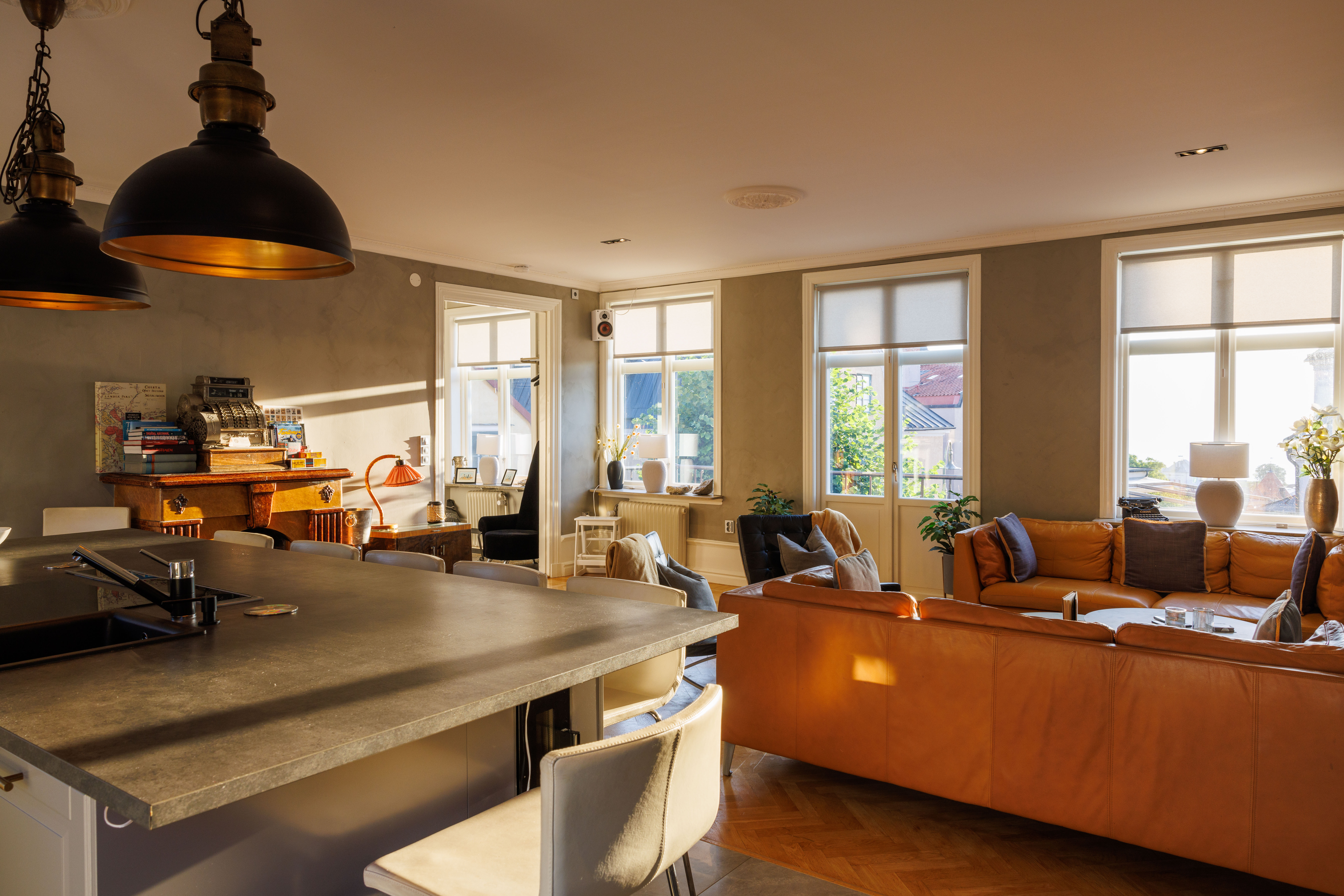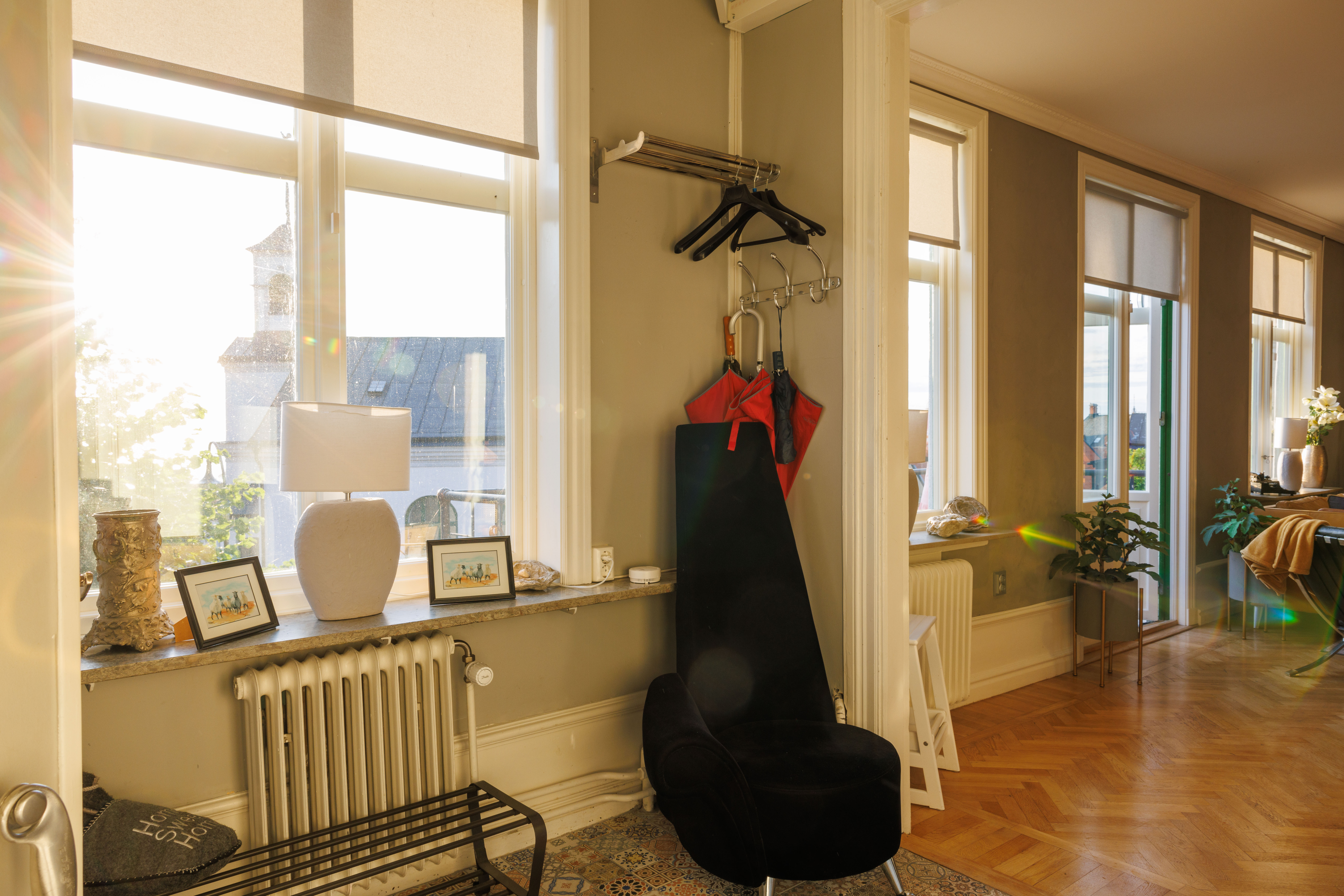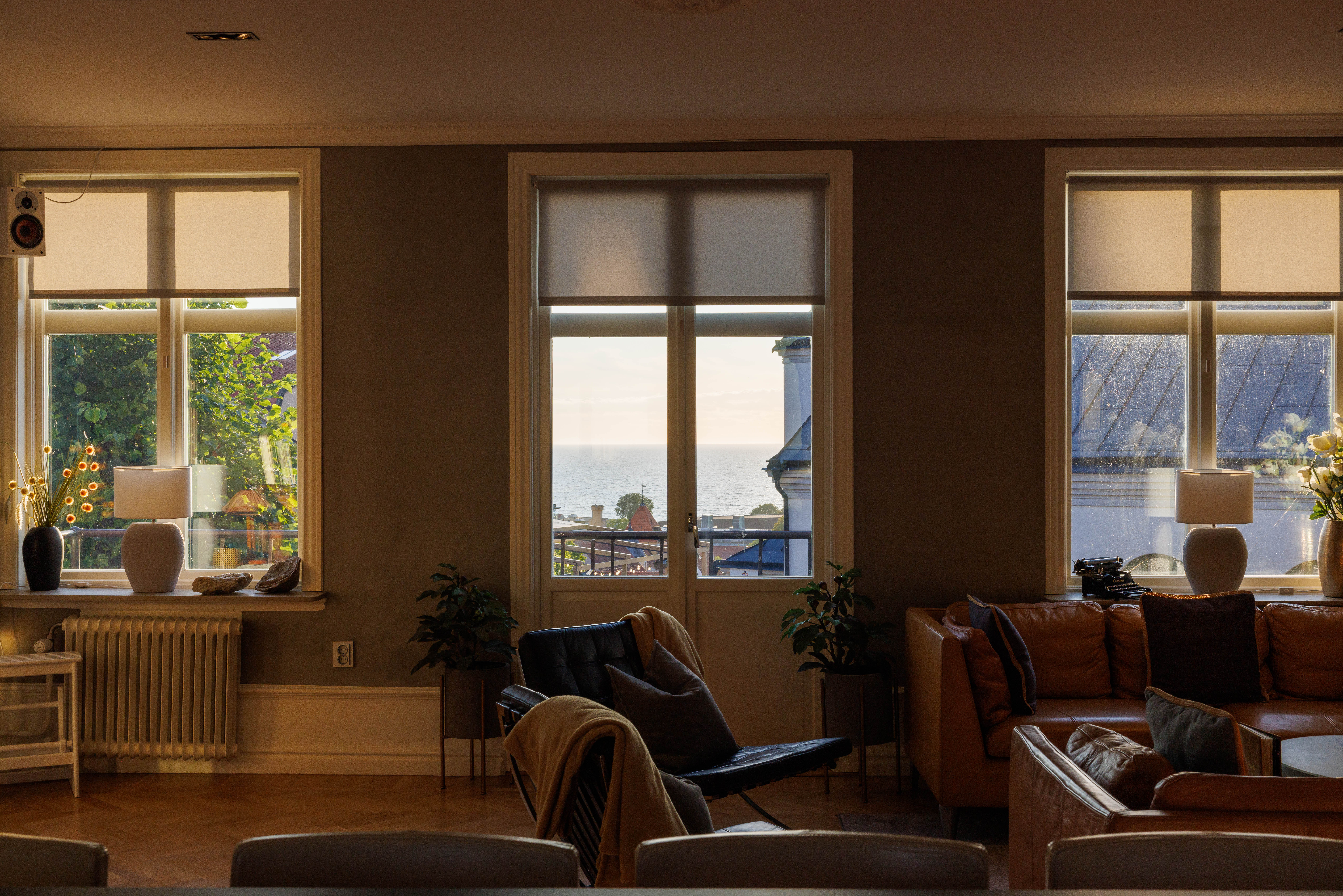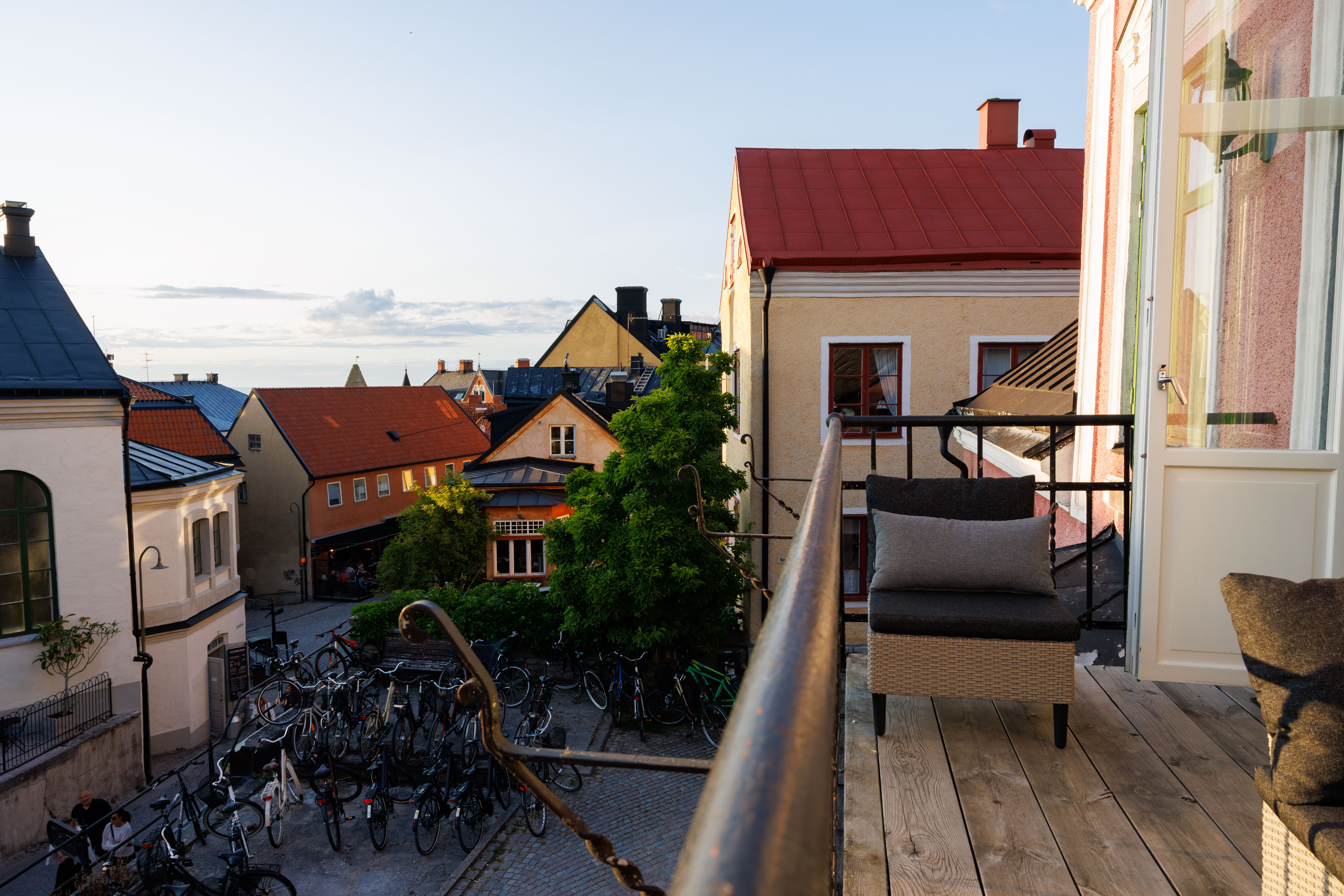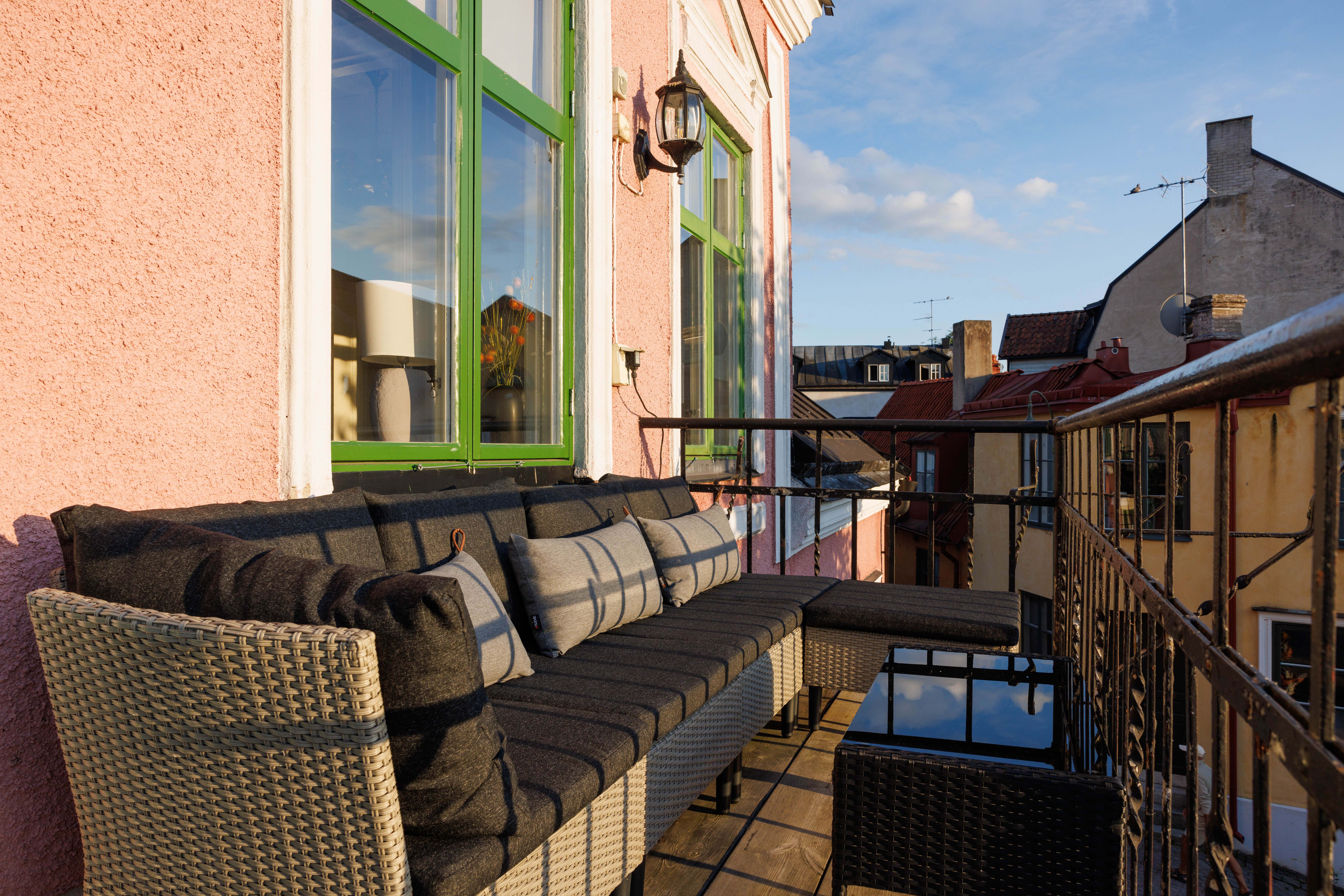 Balkong ut mot Adelsgatan med loungegrupp där man njuter av kvällssolen och