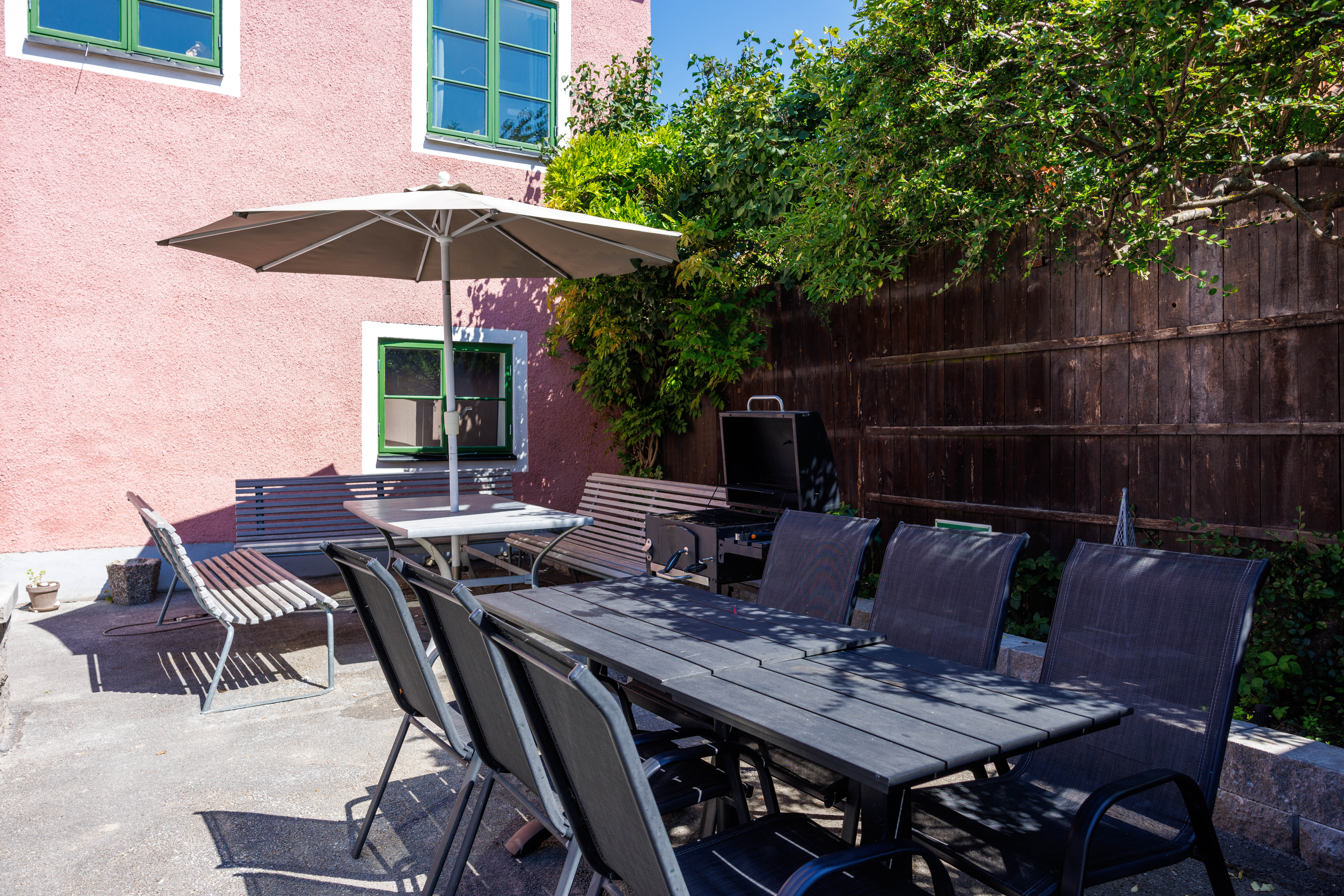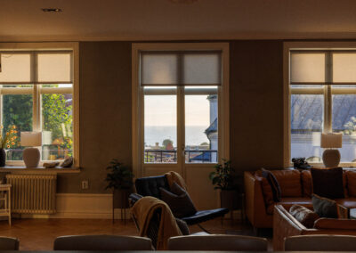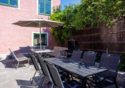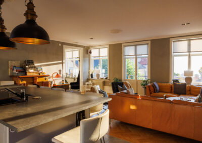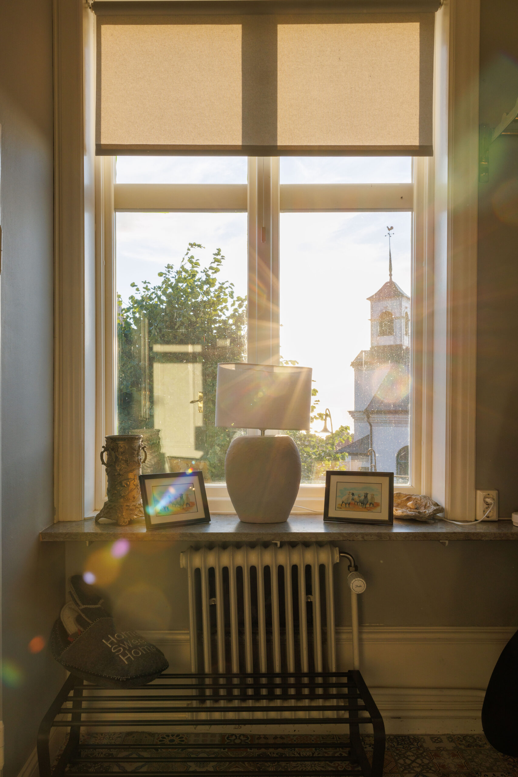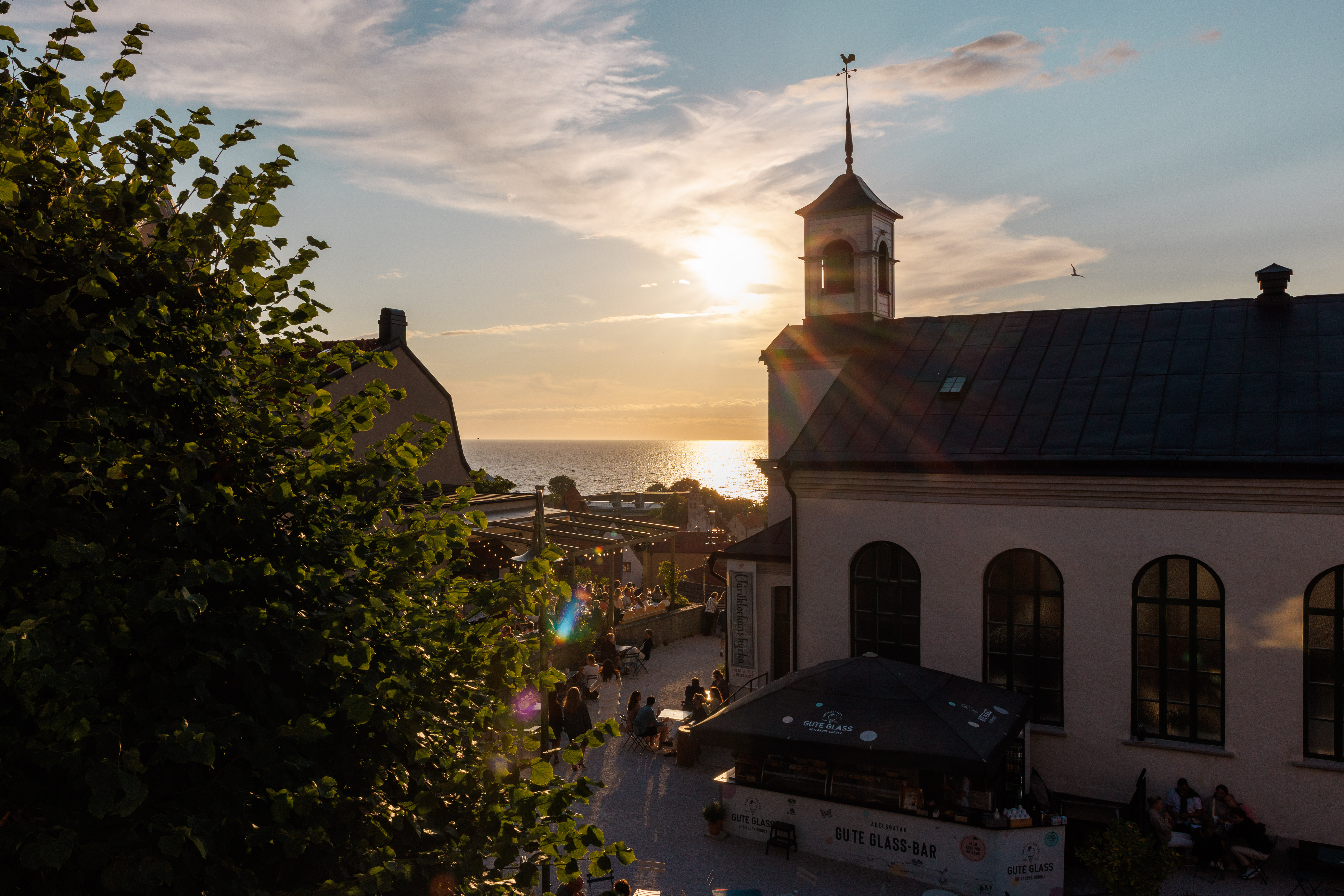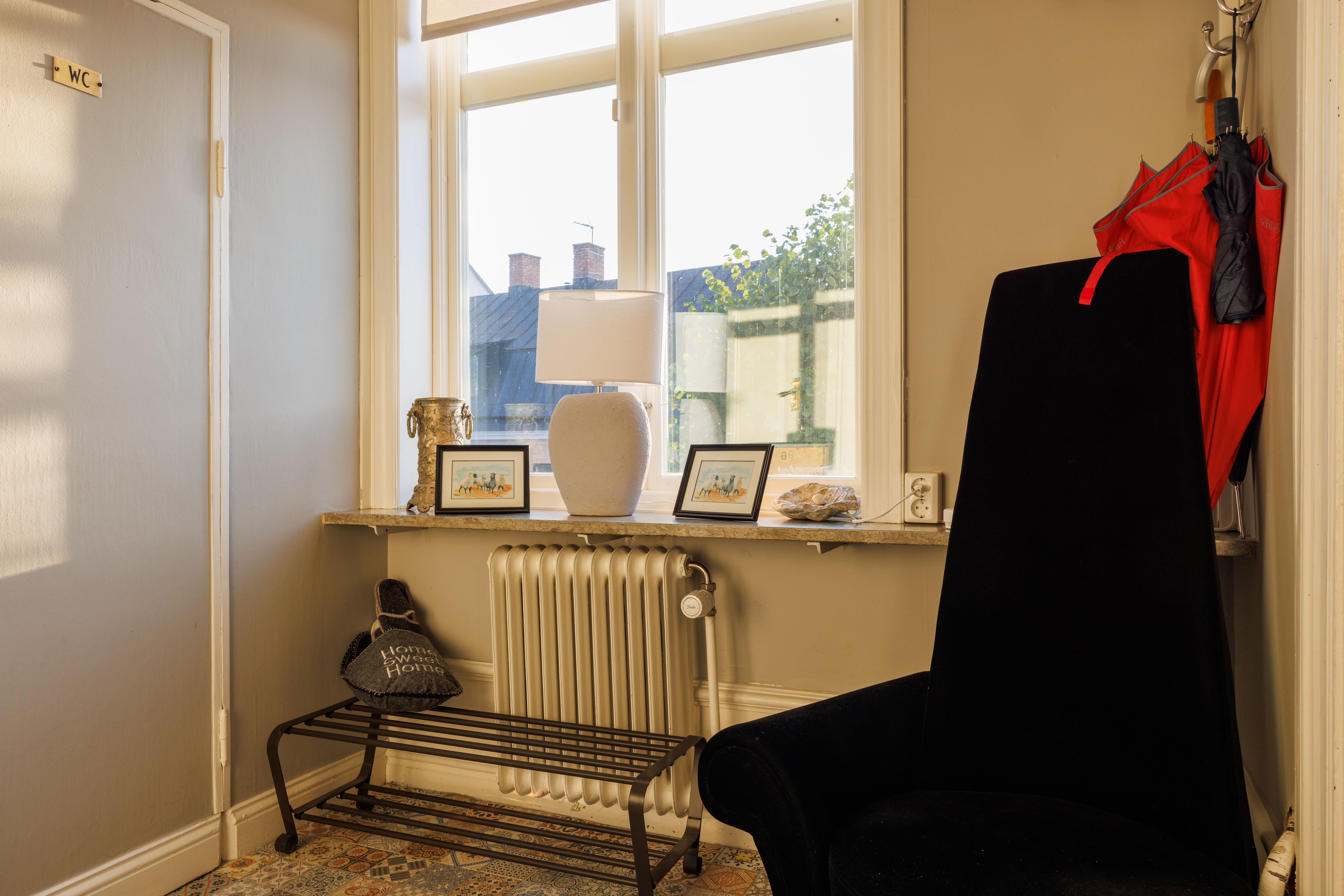Balkong ut mot Adelsgatan med loungegrupp där man njuter av kvällssolen och